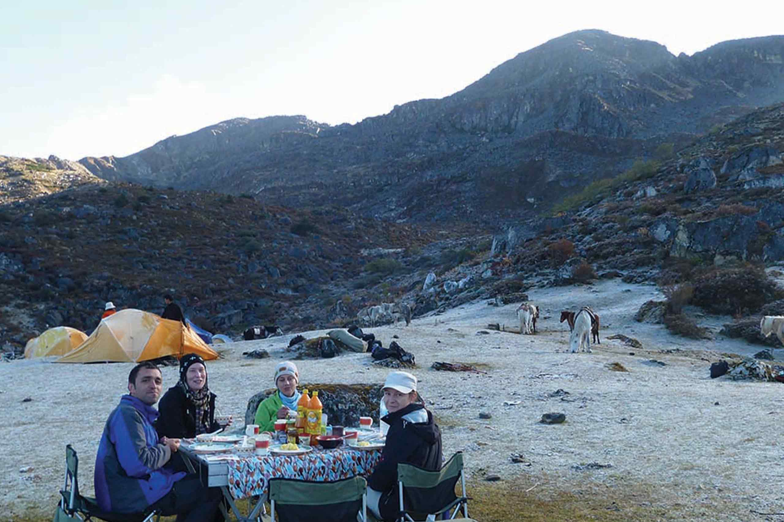 While trekking across the ridges, enjoy the beauty of the mountain vegetation. The meadows are refreshing and inspiring. The first pass symbolizes by a huge cairn gives spectacular view of Kanchenjunga (in Sikkim) and Bhutanese Himalaya peaks. Once descend into the Labatama valley ascend gradually through the valley pass some Yak harder huts till you reach to the camp.